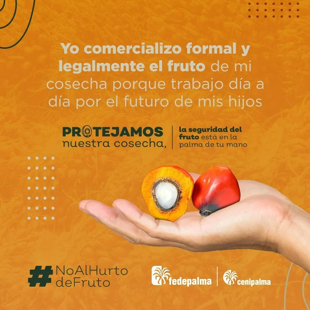 Los palmicultores de Colombia se han visto afectados por el aumento del robo de fruto de palma de aceite principalmente en la Zona Central del país, lo que ha llevado a que empresas palmeras, autoridades y productores se unan en la campaña: “Protegiendo nuestra cosecha, la seguridad del fruto está en la palma de tu mano”, liderada por Fedepalma con el objetivo de generar conciencia sobre las buenas prácticas de comercialización, promover la seguridad en las regiones palmeras e invitar a la comunidad a realizar acciones conjuntas para proteger el patrimonio económico del sector.